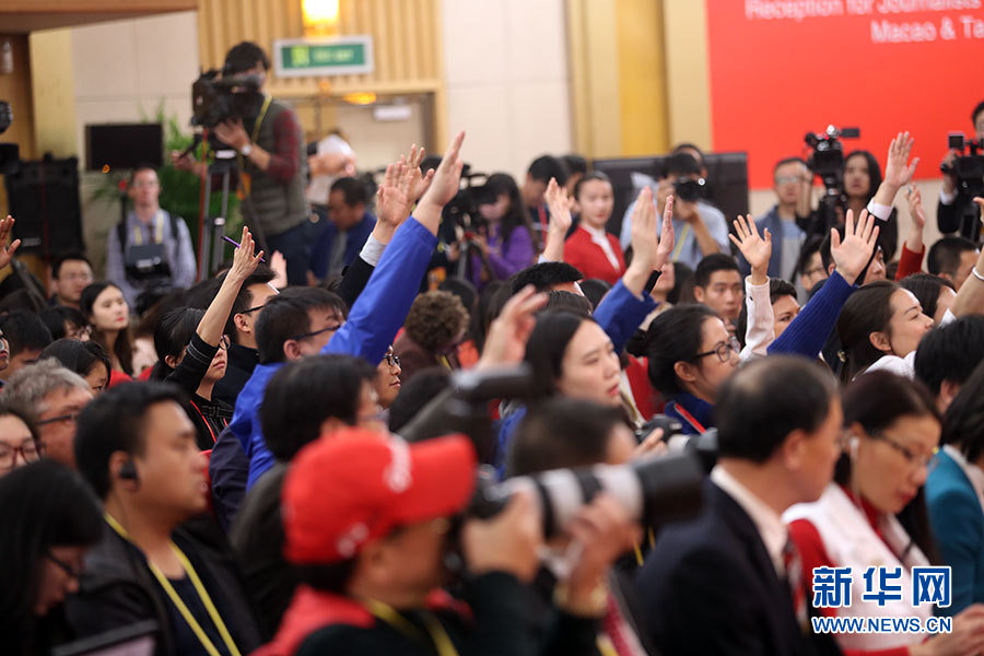 10月23日,十九大新聞中心舉辦記者招待會,邀請中央財經領導小組辦公室副主任楊偉民,環境保護部黨組書記、部長李干杰介紹踐行綠色發展理念,建設美麗中國有關情況,并回答記者提問。圖為現場記者。新華網 郝廣鵬攝