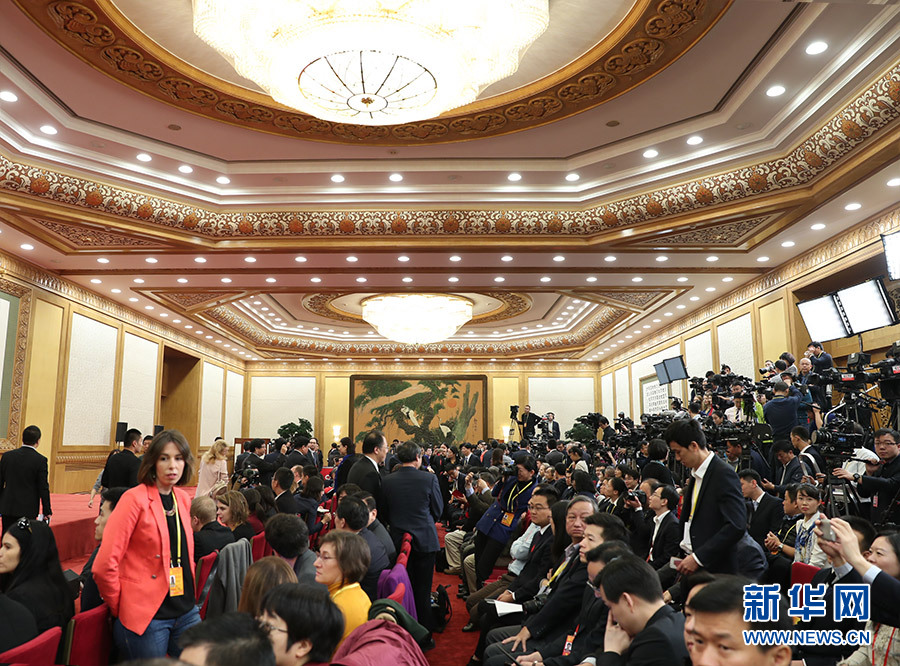 10月25日,黨的十九屆中央委員會第一次全體會議新選出的中央政治局常委將同中外記者見面。圖為中外記者在見面會現場進行準備工作。新華網 翟子赫 攝