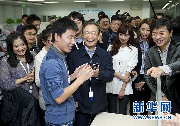 ??? 12月13日,國務(wù)院總理溫家寶到北京中關(guān)村考察并與部分企業(yè)負(fù)責(zé)人座談。這是溫家寶在百度公司考察時,試用手機語音搜索。 新華社記者黃敬文 攝