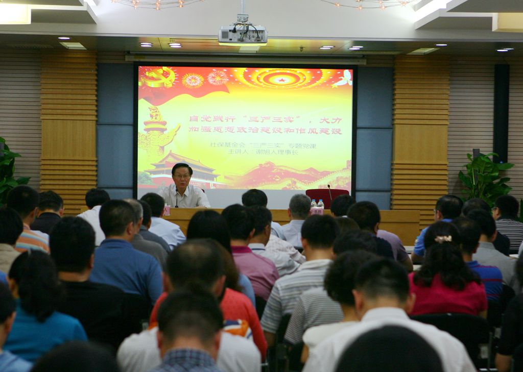 5月25日下午,全國社會保障基金理事會謝旭人理事長為全體干部職工講授了題為“自覺踐行三嚴三實,大力加強思想政治建設和作風建設”的專題黨課,同時對開展“三嚴三實”專題教育進行了動員。于革勝副理事長主持會議,中央組織部干部四局張晨光同志應邀參加。