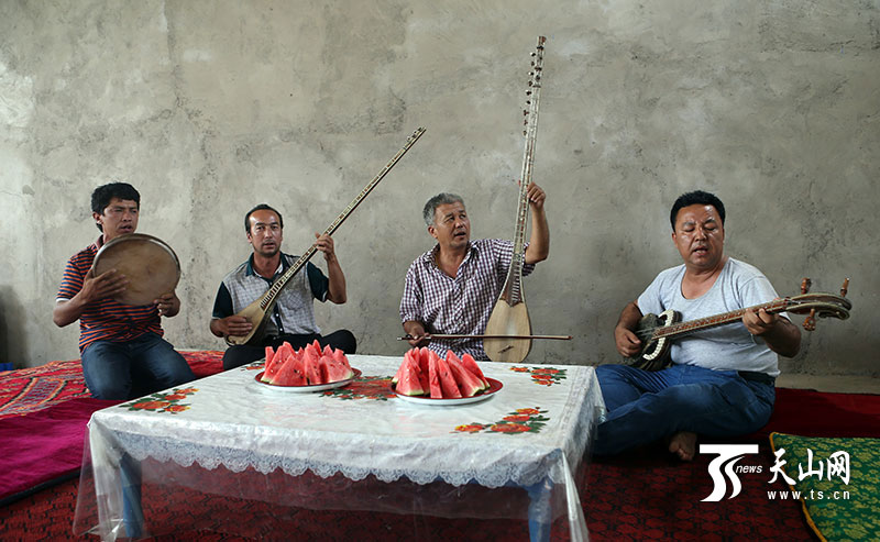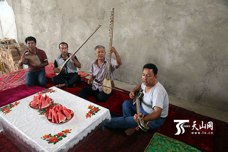 7月10日,蘇來曼·阿不都(右二)與村里的民間藝人一起奏唱《十二木卡姆》。新疆經濟報記者 李瑞 攝