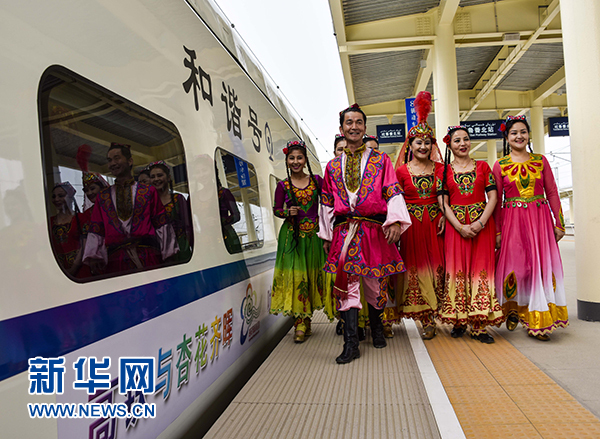 身穿民族服飾的當地居民在吐魯番北站迎接首批乘坐“高鐵杏花專列”抵達前來旅游的游客(2015年3月21日攝)。 新華社記者 趙戈 攝