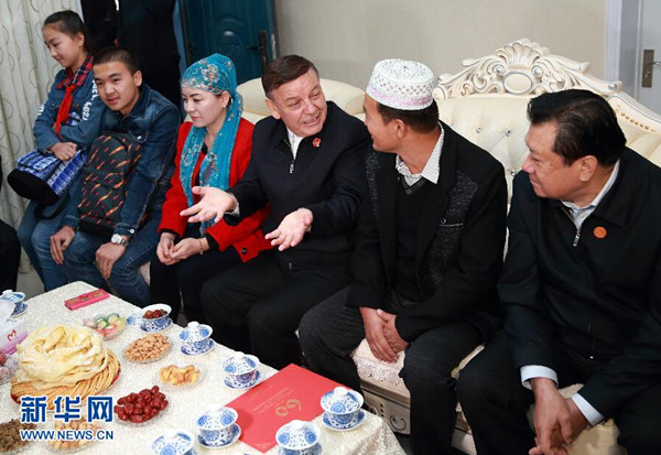 ????9月28日,全國人大常委會副委員長、中央代表團副團長艾力更·依明巴海率中央代表團三分團在昌吉回族自治州、烏魯木齊市看望慰問當地各族干部群眾。這是艾力更·依明巴海在昌吉市榆樹溝鎮閔昌回民新村看望回族村民丁虎一家。新華社記者丁海濤攝
