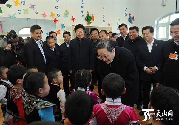 俞正聲仔細(xì)聽(tīng)取新村牧民定居建設(shè)情況介紹,走進(jìn)新村幼兒園送上益智玩具等幼教器具,觀看教學(xué)點(diǎn)雙語(yǔ)教學(xué),與小朋友們一起拍手唱兒歌《小兔兒乖乖》,聽(tīng)二年級(jí)學(xué)生朗誦童謠《我的家鄉(xiāng)也拉曼》,氣氛幸福溫暖。