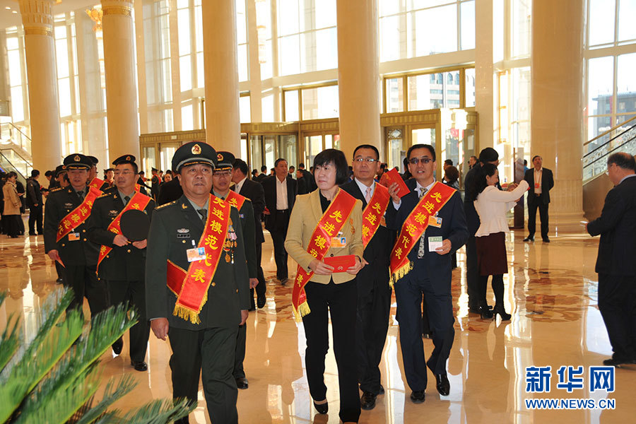 ??? 10月1日,慶祝中華人民共和國成立66周年暨新疆維吾爾自治區成立60周年大會在新疆人民會堂舉行。圖為先進模范代表入場。新華網記者 王新彪 攝