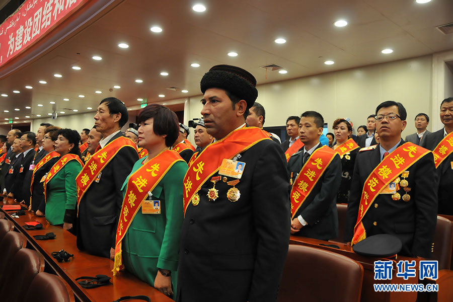 ? 10月1日,慶祝中華人民共和國成立66周年暨新疆維吾爾自治區成立60周年大會在新疆人民會堂舉行。圖為大會現場全體起立唱國歌。新華網記者?王新彪 攝