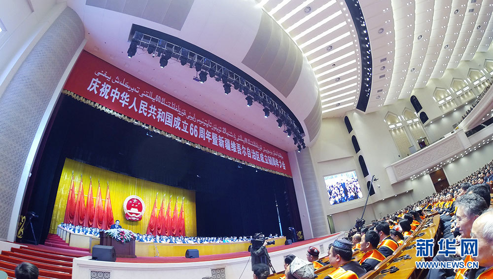 ? 10月1日,慶祝中華人民共和國成立66周年暨新疆維吾爾自治區成立60周年大會在新疆人民會堂舉行。圖為大會現場。新華網記者 郭小天 攝