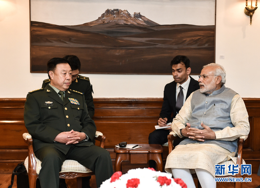 ??? 11月17日,正在印度訪(fǎng)問(wèn)的中央軍委副主席范長(zhǎng)龍(前左)在新德里會(huì)見(jiàn)印度總理莫迪(前右)。 新華社發(fā)