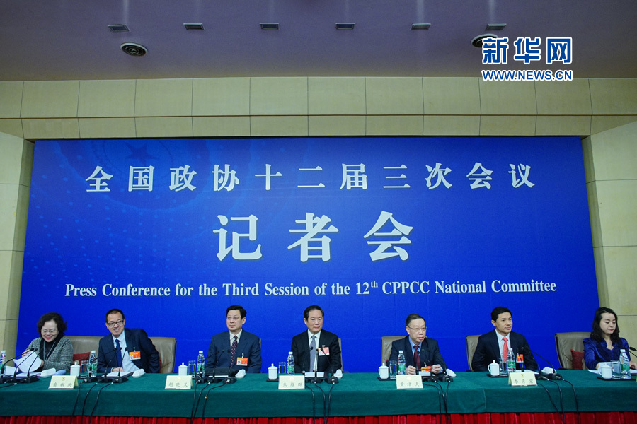 ?? 全國政協十二屆三次會議舉行記者會,邀請全國政協常委朱維群、黃潔夫和全國政協委員胡曉義、李彥宏、俞敏洪等談促進民生改善與社會和諧穩定,并回答記者提問。圖為記者會現場。新華網/中國政府網?郭小天 攝