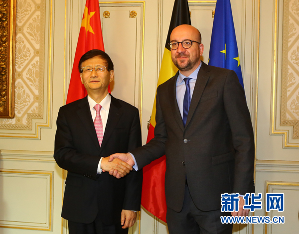 5月19日,在比利時(shí)首都布魯塞爾,比利時(shí)首相米歇爾(右)會(huì)見到訪的習(xí)近平主席特使、中共中央政治局委員、中央政法委書記孟建柱。新華社記者龔兵攝