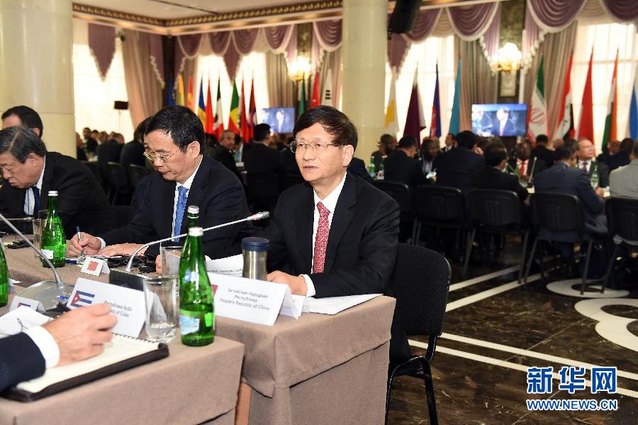 ??? 5月24日,在俄羅斯車臣共和國首府格羅茲尼,中共中央政治局委員、中央政法委書記孟建柱(前右一)在第七屆安全事務高級代表國際會議上發言。中共中央政治局委員、中央政法委書記孟建柱24日在俄羅斯車臣出席第七屆安全事務高級代表國際會議。來自70余個國家和國際組織的代表就深化國際安全合作、有效應對恐怖主義等問題進行探討。新華社發(郝帆攝)