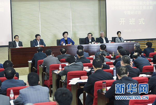 新華社北京10月17日電 中央組織部、中央黨校、科技部聯合舉辦的省部級干部“學習貫徹全國科技創新大會精神加快實施創新驅動發展戰略”專題研討班17日在京開班。中共中央政治局委員、國務院副總理劉延東在開班式上強調,要深入學習貫徹習近平總書記系列重要講話精神特別是科技創新思想,按照黨中央、國務院決策部署,落實全國科技創新大會各項任務,加快提高自主創新能力,完善國家科技創新體系,積極培育創新發展新動能,為建設世界科技強國、實現中華民族偉大復興作出應有貢獻。