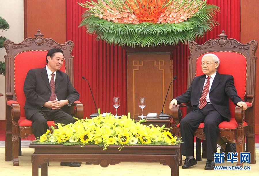 12月22日,越南共產(chǎn)黨中央總書(shū)記阮富仲(右)在河內(nèi)會(huì)見(jiàn)率中共代表團(tuán)出席第十二次中越兩黨理論研討會(huì)的中共中央政治局委員、中央書(shū)記處書(shū)記、中宣部部長(zhǎng)劉奇葆。新華社記者樂(lè)艷娜攝