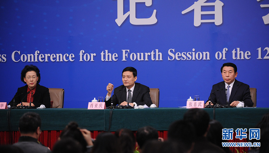 ?????十二屆全國人大四次會議新聞中心于3月12日(星期六)14時30分在梅地亞中心多功能廳舉行記者會,邀請國務院國有資產監督管理委員會主任肖亞慶、副主任張喜武、副主任黃丹華和副秘書長、新聞發言人彭華崗就“國企改革”的相關問題回答中外記者的提問。圖為肖亞慶回答記者提問。新華網/中國政府網 陳杰 攝