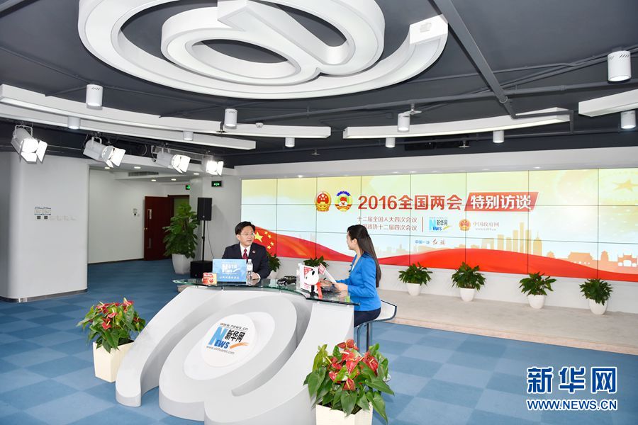 ????2016年3月13日,最高人民檢察院辦公廳主任、新聞辦主任王松苗做客新華網(wǎng)兩會(huì)訪談直播間。圖為新華網(wǎng)兩會(huì)訪談直播間。新華網(wǎng) 付宇鵬 攝