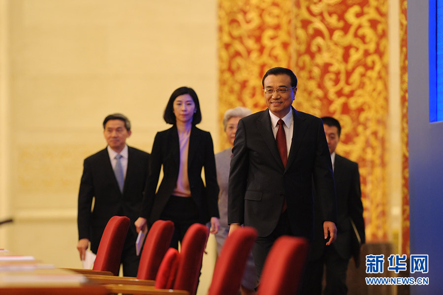 3月16日上午,國務院總理李克強在人民大會堂三樓金色大廳會見采訪十二屆全國人大四次會議的中外記者并回答記者提出的問題。圖為李克強步入金色大廳。 新華網/中國政府網 陳杰攝