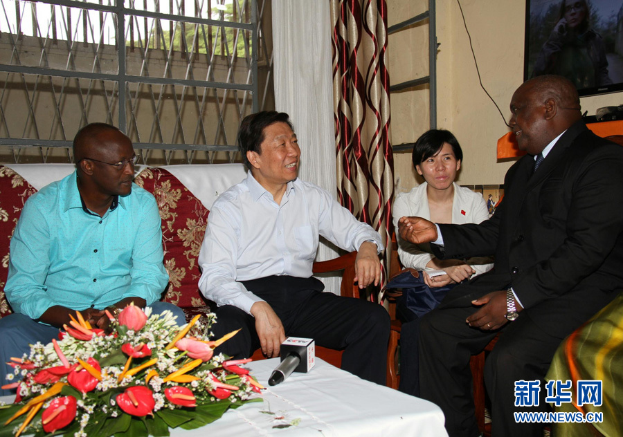 ??? 5月12日,在布隆迪首都布瓊布拉,正在布隆迪訪問的中國國家副主席李源潮(左二)在布第一副總統(tǒng)辛迪姆沃(左一)陪同下,專門來到布隆迪大學(xué)教授勞塞夫(右一)家中走訪,受到了勞塞夫一家的熱情歡迎和接待。新華社記者呂天然攝