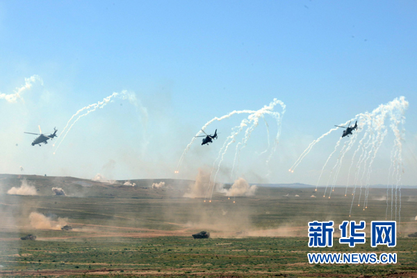 “和平使命-2014”聯(lián)合軍演中,原陸軍第38集團軍某紅軍團突擊分隊在陸航掩護下沖擊目標(biāo)陣地 (2014年8月26日攝)。新華社發(fā)