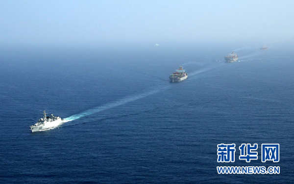 2009年1月6日,在中國(guó)海軍護(hù)航艦艇編隊(duì)武漢號(hào)導(dǎo)彈驅(qū)逐艦的帶領(lǐng)下,被護(hù)航的中國(guó)商船一字排開(kāi)航行。 2009年4月28日,中國(guó)人民解放軍海軍第一批赴亞丁灣護(hù)航編隊(duì),圓滿完成護(hù)航任務(wù)后返回海南三亞某軍港。由武漢號(hào)導(dǎo)彈驅(qū)逐艦、海口號(hào)導(dǎo)彈驅(qū)逐艦和微山湖號(hào)綜合補(bǔ)給艦組成的海軍首批護(hù)航編隊(duì),在124個(gè)日夜里連續(xù)航行33000多海里,為41批166艘船舶實(shí)施了伴隨護(hù)航,為46艘船舶提供了區(qū)域護(hù)航,成功救援了3艘遇襲外國(guó)船只,安全、順利、圓滿地完成了護(hù)航任務(wù)。新華社發(fā)