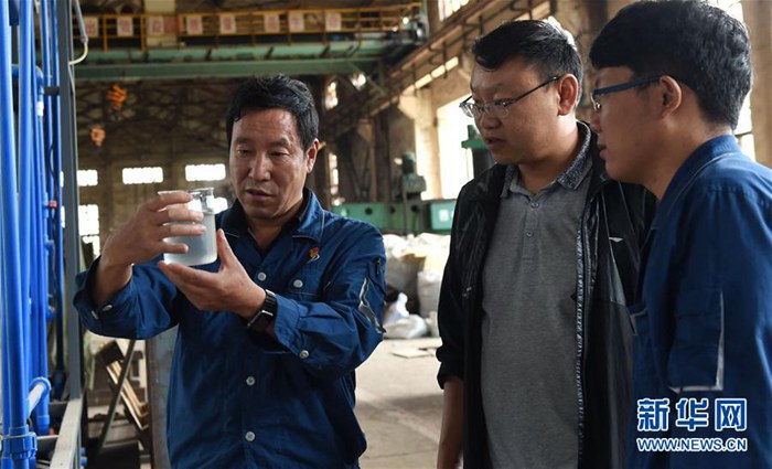 云南冶金昆明重工有限公司首席技師耿家盛(左)在車間里和助手查看生態(tài)環(huán)保廁所的沖水系統(tǒng)經(jīng)過(guò)循環(huán)后的水質(zhì)(9月22日攝)。新華社記者 藺以光 攝