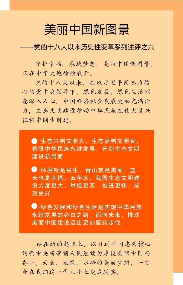 站在新的起點(diǎn)上,以習(xí)近平同志為核心的黨中央將帶領(lǐng)人民繼續(xù)為建設(shè)美麗中國而奮斗。天藍(lán)、地綠、水凈的美麗夢想,一定會(huì)在我們這一代人手上變成現(xiàn)實(shí)。