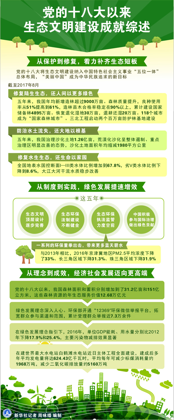 黨的十八大以來,在以習(xí)近平同志為核心的黨中央領(lǐng)導(dǎo)下,綠色發(fā)展、綠色生活理念深入人心,中國經(jīng)濟(jì)社會(huì)發(fā)展更加充滿活力,生態(tài)文明建設(shè)推動(dòng)中華民族在偉大復(fù)興征程中闊步前進(jìn)。
