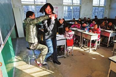 這節課,學生們聽得很認真。45分鐘的課程很快過去,下課后,妻子又把曹老師背了下來。“我們愛曹教師。”班里許多小朋友告訴記者。