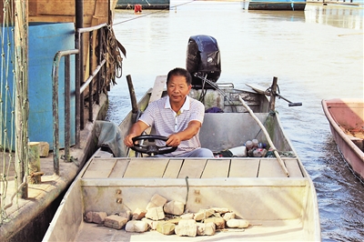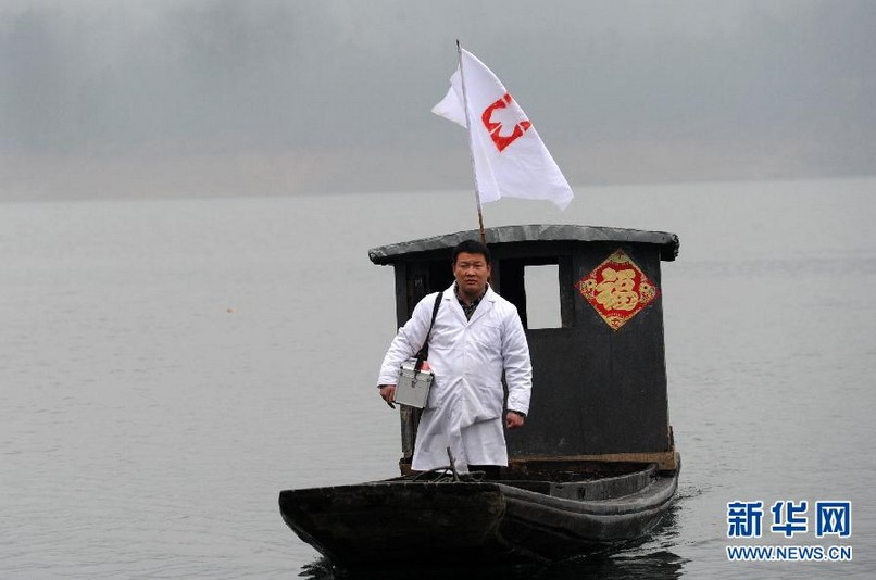 海島的東島岸邊,常年停靠著一個船屋,外面掛著“麻埠鎮齊山村海島衛生站”的牌子。39歲的余家軍是船屋的主人,1999年衛校畢業后回到齊山村,和妻子吳起嬌把家安到了船上,取名“海島衛生站”,他也成了這里唯一的村醫。18年里,不論是白天黑夜、刮風下雨甚至下雪,余家軍都劃著一條小木船,每日來往于東西兩島之間,為200多名村民看病,這條木船也被村民們親切地稱為“水上120”。