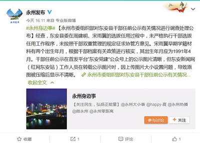 新京報此前報道,12月10日,湖南東安縣組織部發布的一份“干部簡歷公示”通告引發廣泛質疑。多名永州當地網友發文稱,名單中擬提拔人員簡歷,其中有干部工作經歷存在疑點。