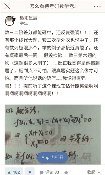 昨天上午,多名網(wǎng)友發(fā)微博爆料稱,2018年全國碩士研究生統(tǒng)一招生考試數(shù)學科目出現(xiàn)“神押題”,一位名為“李林”的教師在考前押題視頻中舉的例題與實際考研的考試試題十分相似。網(wǎng)友指出,李林押題“命中率”高達80%,甚至連超綱的二階差分都反復強調(diào)。“每年押中幾個題已經(jīng)很牛了,這位老師押中線代大題原題、證明題原題也就罷了,連超綱的二階微分都猜中,并且反復強調(diào)。”