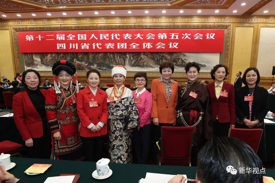四川是一個多民族聚居的省份。習近平走進會場時,身著民族服裝的藏族、彝族、羌族代表向總書記問好。藏族、羌族代表分別獻上了潔白的哈達和鮮艷的羌紅,表達對總書記的敬意,祝福中華民族繁榮昌盛。習近平請他們轉達對各族同胞的祝福。