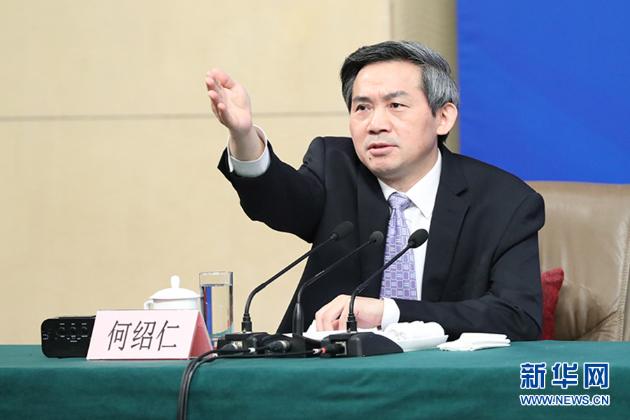 3月11日,十二屆全國人大五次會議新聞中心舉行記者會,主題是“改革開放調(diào)結(jié)構(gòu) 創(chuàng)新驅(qū)動促發(fā)展”,商務(wù)部部長鐘山、副部長王受文、副部長錢克明出席并回答中外記者的提問。圖為記者會主持人何紹仁。 新華網(wǎng)/中國政府網(wǎng) 傅義洲 攝