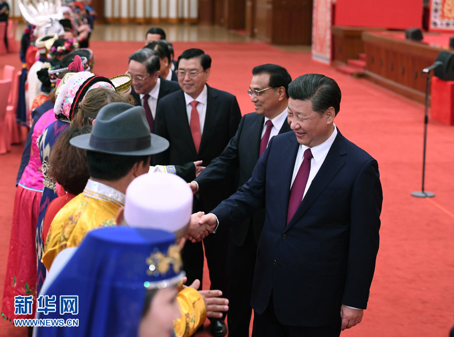 3月11日晚,中共中央統(tǒng)戰(zhàn)部、全國人大民族委員會、國家民族事務(wù)委員會、全國政協(xié)民族和宗教委員會在北京人民大會堂舉行茶話會,黨和國家領(lǐng)導(dǎo)人習(xí)近平、李克強、張德江、俞正聲、劉云山、王岐山、張高麗等與出席十二屆全國人大五次會議和全國政協(xié)十二屆五次會議的少數(shù)民族代表委員們歡聚一堂,共慶全國兩會勝利召開,共祝偉大祖國繁榮昌盛,共話中華民族美好未來。新華社記者 李學(xué)仁 攝