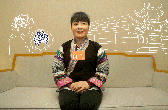 ??? ——全國(guó)人大代表蔡群在老家貴州畢節(jié)織金縣官寨鄉(xiāng)大寨村苗寨開了一家苗族蠟染刺繡公司,帶動(dòng)寨子里300多名外出打工的婦女一起回鄉(xiāng)創(chuàng)業(yè)。