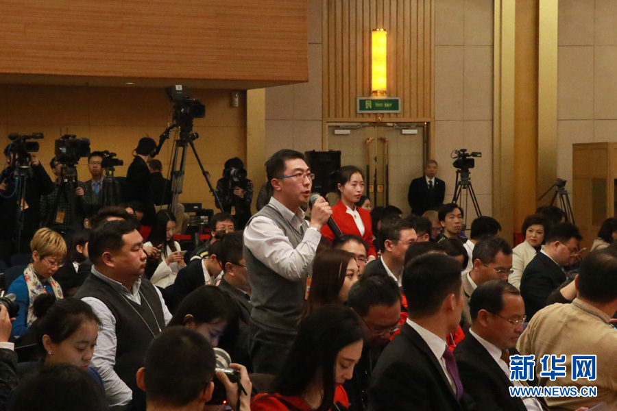 3月14日,十二屆全國人大五次會議新聞中心舉行記者會,邀請國家質檢總局局長支樹平、副局長兼國家認證認可監督管理委員會主任孫大偉、國家標準化管理委員會主任田世宏就“質量提升”的相關問題回答中外記者的提問。圖為中國食品安全報記者提問。新華網/中國政府網 傅義洲 攝?