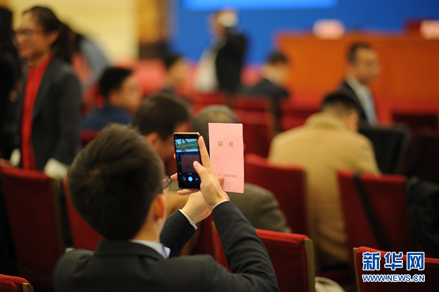 3月15日上午,國務院總理李克強在人民大會堂三樓金色大廳會見采訪十二屆全國人大五次會議的中外記者并回答記者提出的問題。圖為在記者會現場等待的記者。新華網/中國政府網 翟子赫 攝