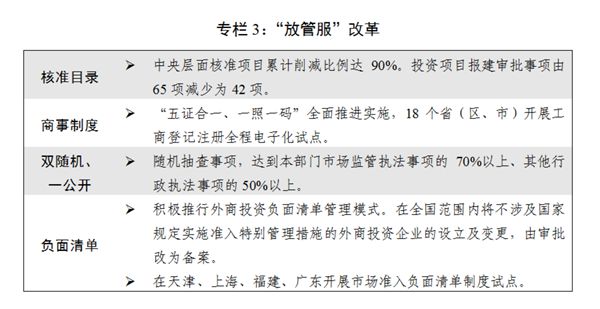 一是簡政放權放管結合優化服務改革向縱深推進。在提前完成本屆政府減少行政審批事項三分之一目標的基礎上,去年又取消165項國務院部門及其指定地方實施的審批事項,清理規范192項審批中介服務事項、220項職業資格許可認定事項。第三次修訂政府核準的投資項目目錄。商事制度改革繼續深化。全面推行“雙隨機、一公開”,增強事中事后監管的有效性,推進“互聯網+政務服務”。市場準入負面清單制度改革試點開局良好。“放管服”四大平臺建成運行。