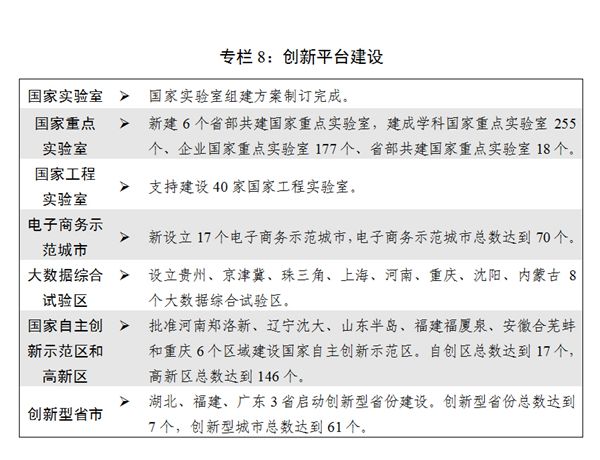 一是創新能力持續提升。由點及面、有序布局重大科技創新平臺建設,深入推進8個區域全面創新改革試驗。北京、上海建設科技創新中心邁出新步伐。河北·京南、浙江、寧波3個國家科技成果轉移轉化示范區啟動建設。首個國家高速列車技術創新中心建成。完全自主知識產權中國標準高速列車正式投入運營。建成世界最大單口徑射電望遠鏡(FAST)等一批重大科技基礎設施,在量子通信、航空航天等方面取得一批重大科技成果。國家科技重大專項深入實施,科技創新2030-重大項目遴選確定。大力推動企業技術創新,落實好研發費用加計扣除、股權激勵和技術入股所得稅優惠、完善高新技術企業認定辦法等政策。