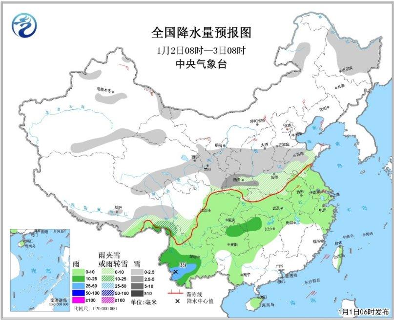 2日08時至3日08時,中東部有大范圍雨雪天氣。西藏東部、青海東部和南部、西北地區(qū)東部、華北南部、黃淮大部等地有小到中雪或雨夾雪;西南地區(qū)大部、江漢、黃淮東南部、江淮、江南北部、廣西西部等地有小到中雨,其中云南西南部的部分地區(qū)有大雨;內(nèi)蒙古中西部、遼東半島、黃淮東部、江淮東部等地有4~6級風(fēng)。南海東部有6~8級、陣風(fēng)9~10級大風(fēng)。