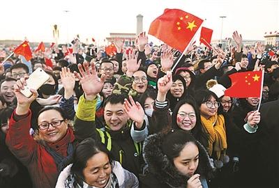 “再堅(jiān)持一下,還有30分鐘。”太陽升起前氣溫低至-5℃至-6℃。在等待的人群中,大家相互鼓勵(lì)。7時(shí)25分,“中國(guó),加油!”不知道誰在隊(duì)伍里喊了一句,緊接著,一陣又一陣的歡呼聲,一浪高過一浪,直到升旗儀式開始。