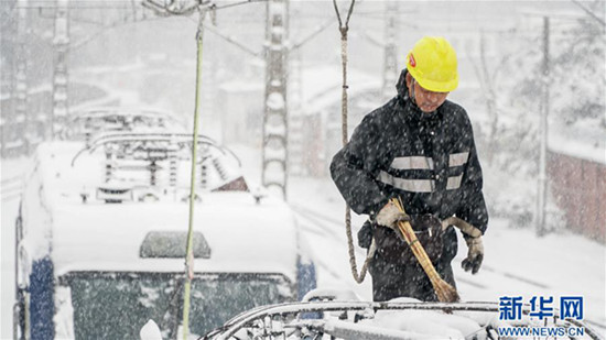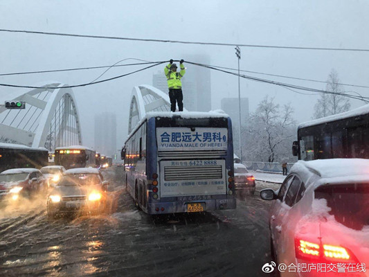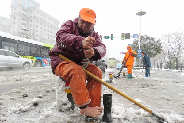 通訊電纜被壓落導致交通癱瘓 執勤協警爬上公交車頂 用雙手托舉電纜線10多分鐘 城管 暖心! 南京城管掃雪打通道路 兩歲小女孩跑過來說“謝謝叔叔” 環衛工人 擰干濕透的襪子