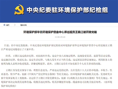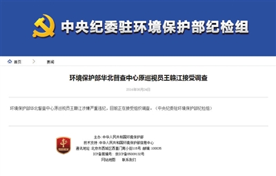 2016年8月24日,中央紀委駐環境保護部紀檢組發布消息,環境保護部華北督查中心原巡視員王贛江涉嫌嚴重違紀,接受組織調查。