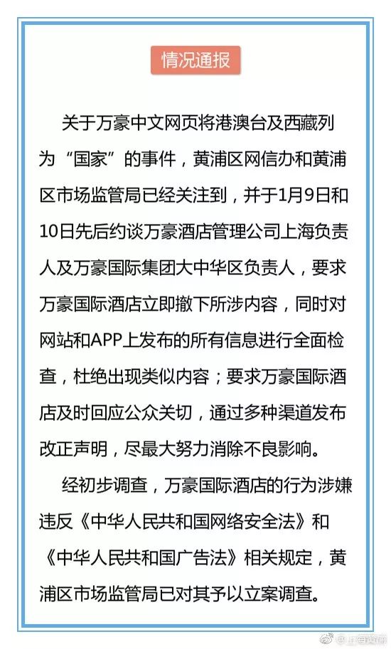 經(jīng)初步調(diào)查,萬豪國際酒店的行為,涉嫌違反《中華人民共和國網(wǎng)絡(luò)安全法》和《中華人民共和國廣告法》相關(guān)規(guī)定,黃浦區(qū)市場(chǎng)監(jiān)管局已對(duì)其予以立案調(diào)查。