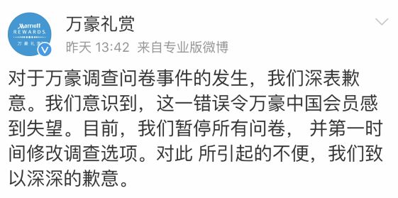 對(duì)于萬豪禮賞會(huì)員調(diào)查問卷的錯(cuò)誤,我們深表歉意。在發(fā)現(xiàn)錯(cuò)誤后,所有問卷調(diào)查已經(jīng)被立即終止。
