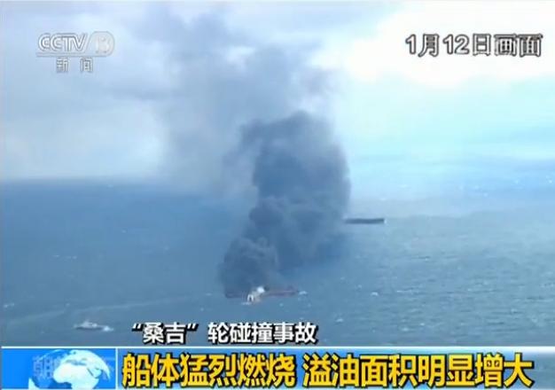 昨天(12日),央視記者登上國家海洋局海監飛機,在空中勘察“桑吉”輪碰撞事故現場。記者發現,桑吉輪船身猛烈燃燒,溢油情況比前兩天明顯增多,火勢已經蔓延到海面,桑吉輪船體傾斜嚴重,非常脆弱。