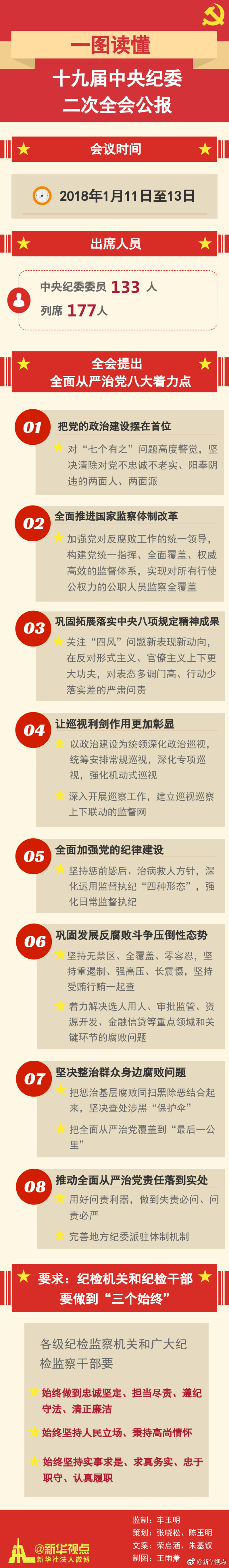 新華網北京1月13日電 13日審議通過的十九屆中央紀委二次全會公報新鮮出爐。想知道全面從嚴治黨如何發力?有這張圖在手,重點、亮點、焦點你都擁有!(據“新華視點”微博報道)
