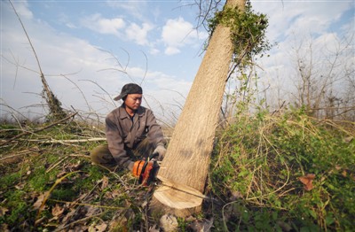 2017年11月27日,南洞庭湖自然保護區核心區內,一名工作人員在清理歐美黑楊?!⌒氯A社記者 李 尕攝