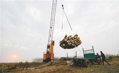 2017年11月27日,南洞庭湖自然保護區核心區內,機械吊臂將被清理的歐美黑楊運上貨車。 新華社記者 李 尕攝