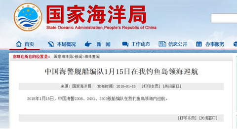 據(jù)國家海洋局網(wǎng)站消息,2017年12月30日,中國海警2306、2502、2106艦船編隊在中國釣魚島領(lǐng)海內(nèi)巡航。2017-12-30 10:09:23
