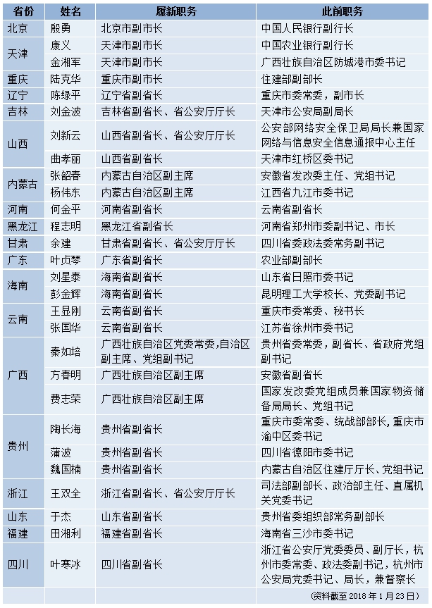新華網北京1月24日電(記者陳淑君 李志強)2018年省級地方兩會大幕開啟,多地黨政領導班子近日迎來密集調整。1月19日到23日,重慶、廣西、甘肅等地省級黨委常委班子成員陸續調整,北京、天津、內蒙古、遼寧等十九省區市28位省級政府副職履新。